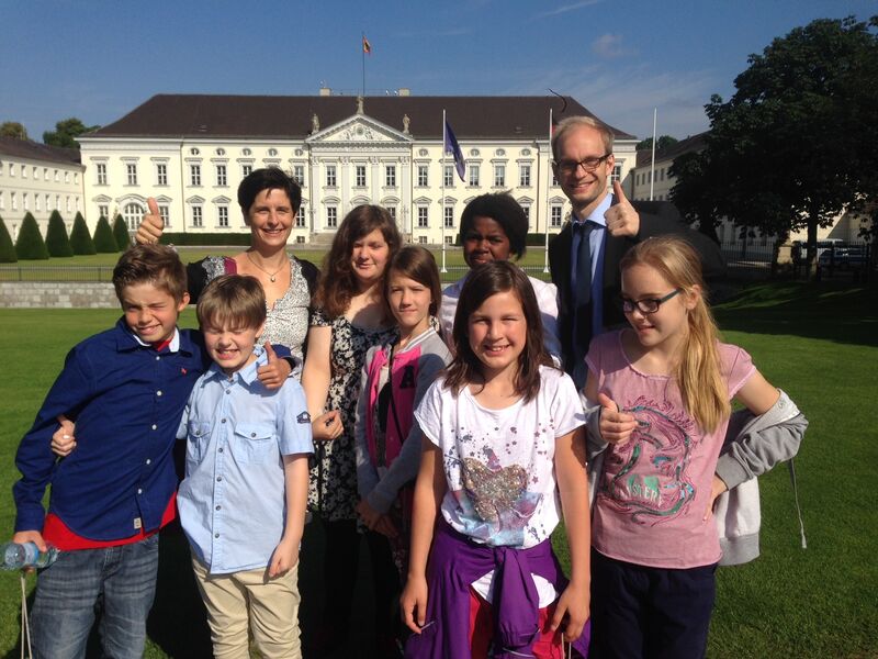 Landessuperintendentin Dr. Ingrid Spieckermann gratuliert den Schülerinnen und Schülern der 5c der Evangelischen IGS Wunstorf zum Gewinn des 3.Preises für nachhaltigen Unterricht, den sie von Bundespräsident Gauck im Schloss Bellevue erhalten haben. Der Preis ist mit 500 Euro dotiert.