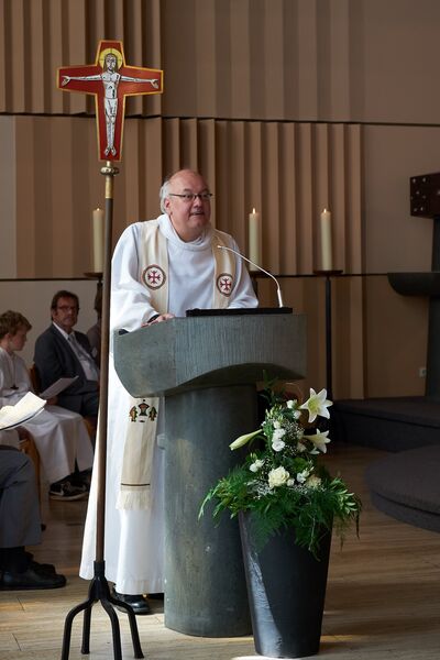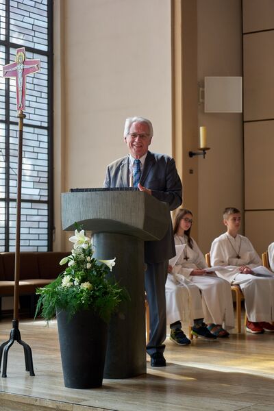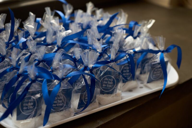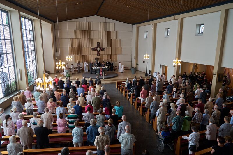 Pfarrgemeinderatsvorsitzender Dr. Josef Lange begrüßte die rund 300 Gäste in der Heilig-Geist-Kirche und verwies auf die eine Taufe als die verbindende Basis im christlichen Glauben. Um dies sichtbar und spürbar zu machen, zeichneten Pfarrer Matthias Kaleth und die Pastoren Katharina Wohlgemuth, Dirk Rademacher sowie Dr. Stephan Vasel den Gottesdienstbesuchern an den vier Taufsteinen der Gemeinden ein Kreuz mit Wasser auf die Hand. Ein kleines Päckchen mit Salz zum Mitnehmen, versehen mit dem Jesus-Wort „Ihr seid das Salz der Erde“, erinnerte an den christlichen Auftrag zum Wirken in der Welt.
