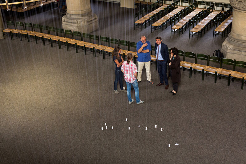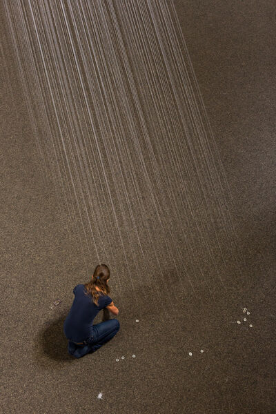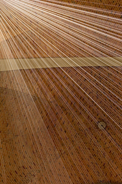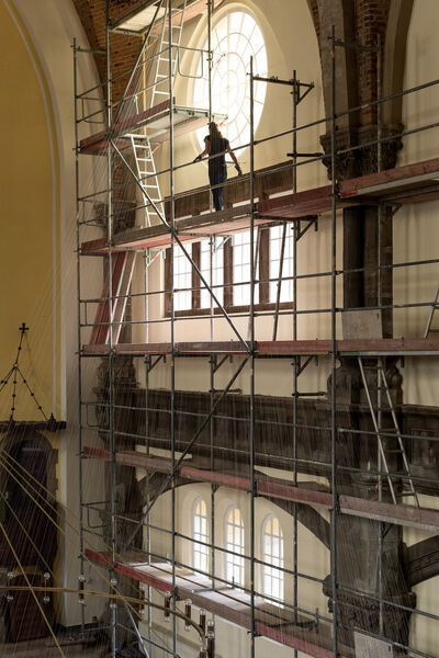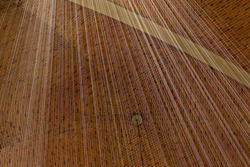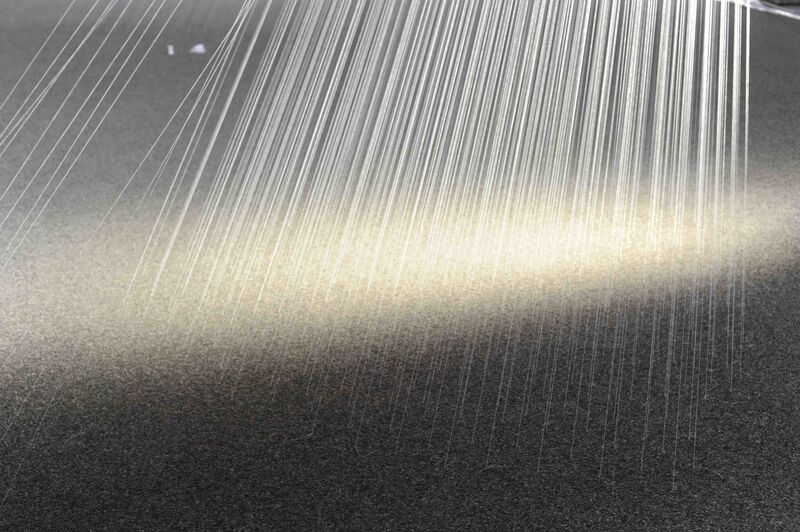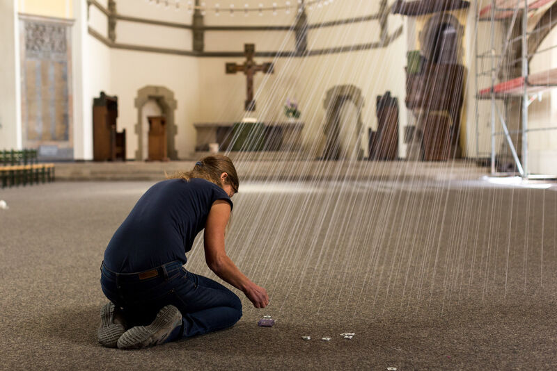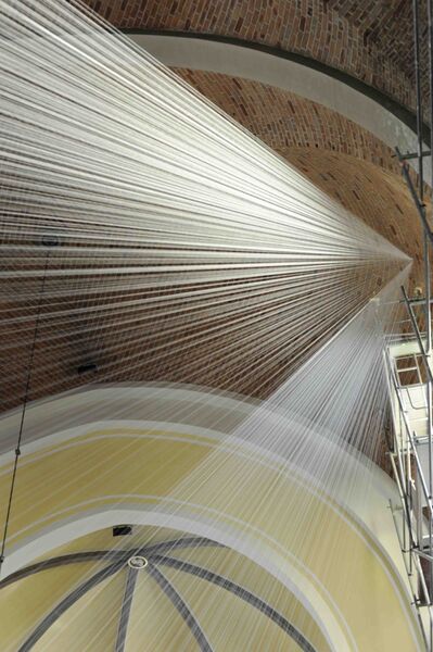 Hinter dem Kunstprojekt verbirgt sich eine Rauminstallation der Künstlerin Elke Maier. Tausende im großen Kirchenschiff gespannte, weiße Fäden reflektieren das Licht. Mit großem Körpereinsatz hat die Künstlerin in wochenlanger Steigarbeit zigtausende Meter feinen Seidengarns im Raum verarbeitet.