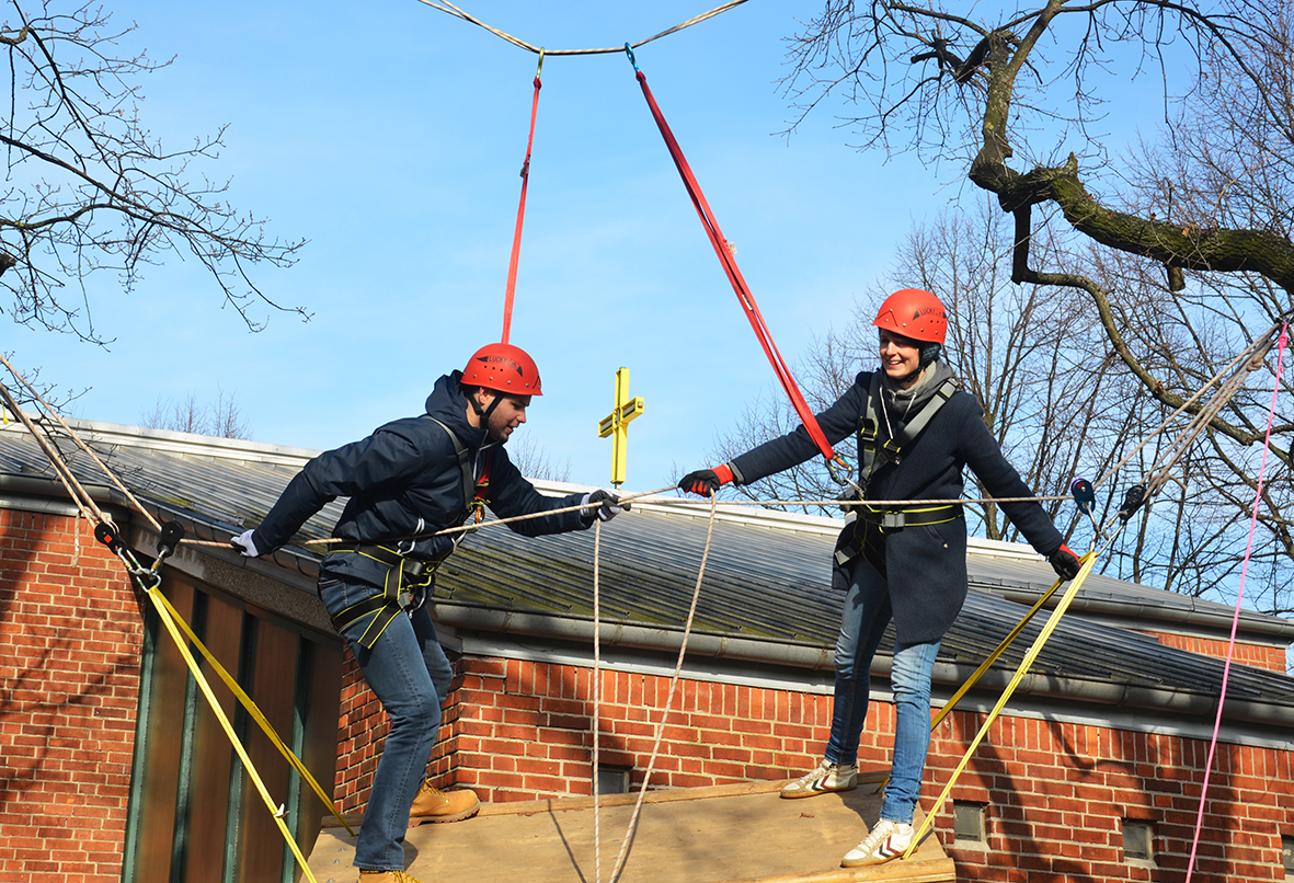 „Das war total gut – man lernt aus den eigenen Fehlern und aus denen der anderen.“ Nadine Förster, Diakonin im Anerkennungsjahr in der Region Gehrden-Wennigsen, ist begeistert: Gerade hat sie sich auf einem an Seilen schwankenden Brett allein mit Muskelkraft und im Team mit Kerstin Dede auf zwei Meter Höhe emporgearbeitet. „Man muss durchschauen, wie das System funktioniert und genau im Blick haben, was die Partnerin macht“, sagt sie weiter – Herausforderungen, die für die Arbeit mit Gruppen ideal sind.