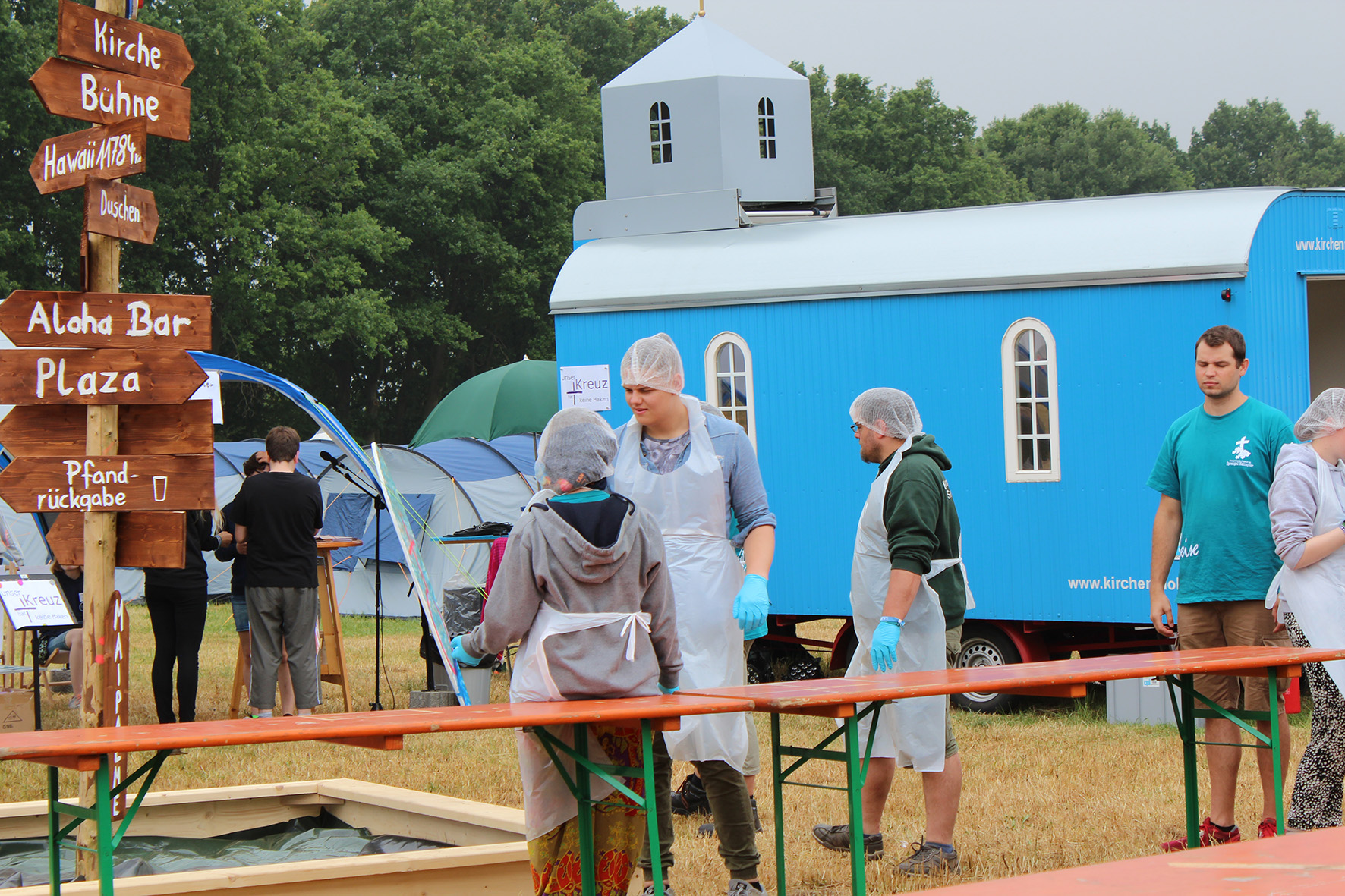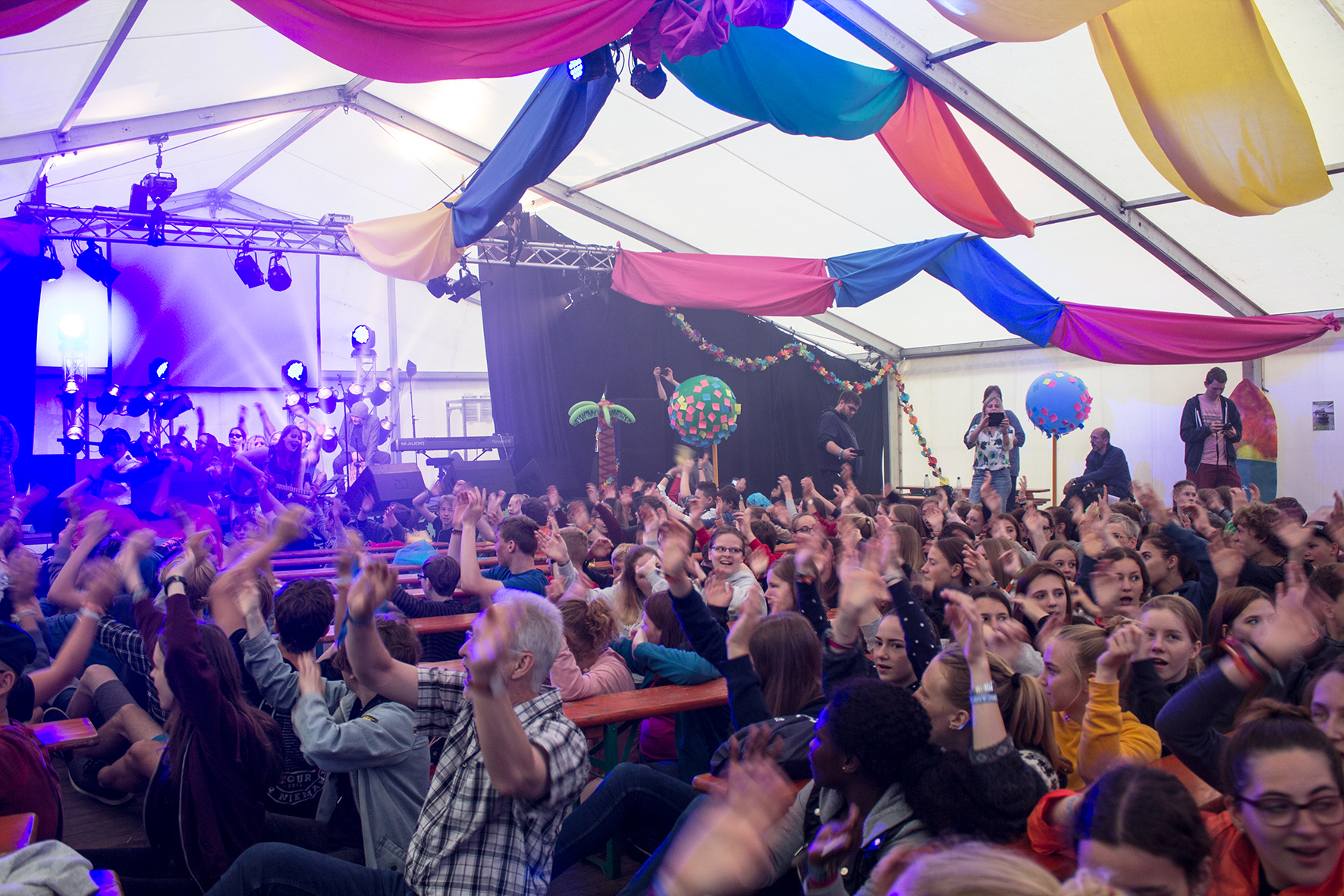 Das Zeltlager in Verden gleicht einer bunten Veranstaltungswiese: ein kleines Dorf aus Zelten und dazwischen sportliche Spiele, Niedrigseilgarten, Kletterpark und einzelne Gruppen, die sich spontan zum Singen und Musizieren zusammenfinden. In 6 großen Versammlungszelten bieten die Sprengel der Landeskirche verschiedene Workshops, Konzerte, Mitmachaktionen und spirituelle Impulse.