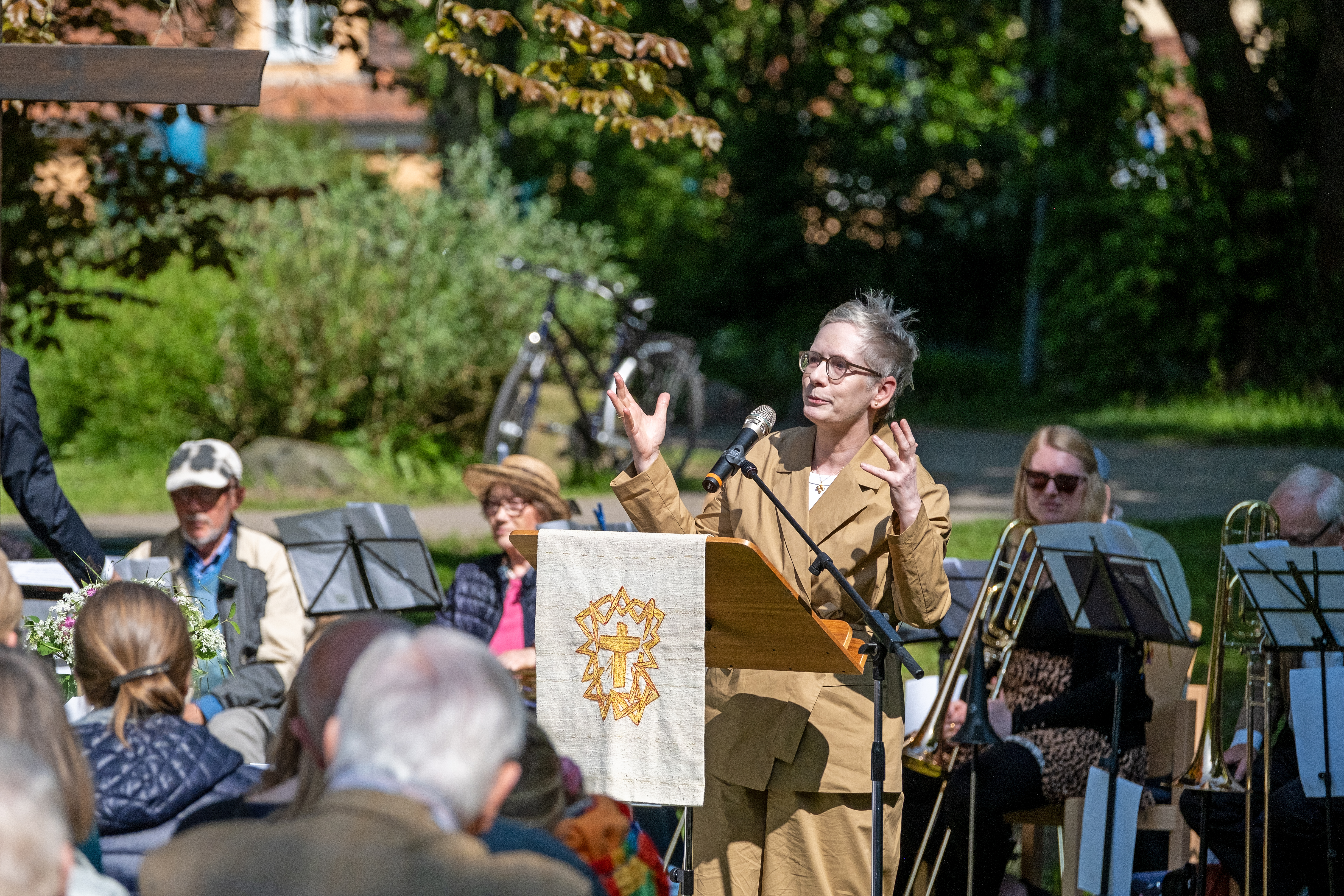 Rund 150 Gäste nahmen an dem Gottesdienst unter blauem Himmel teil. Pastor Henrik Heinicke leitete durch den Gottesdienst. Der Posaunenchor der Kirchengemeinde unter der Leitung von Martin Burzeya-Wille war für die Musik verantwortlich.