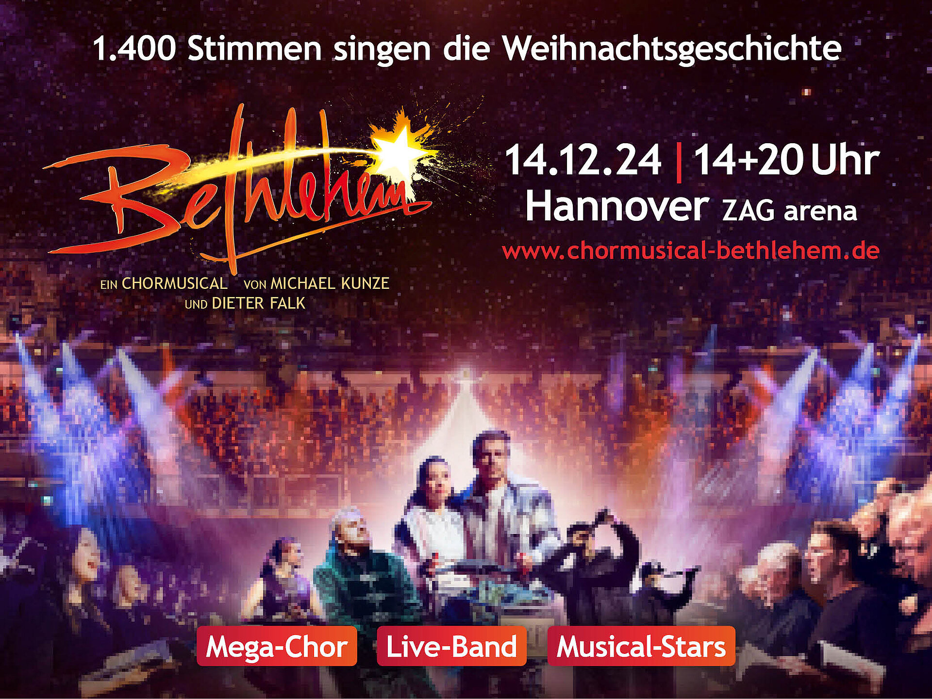 Walsrode/Hannover. Mit Chorproben von insgesamt knapp 2.000 Sängerinnen und Sänger starten an diesem Wochenende die Proben für das Chormusical Bethlehem. Geprobt wird am 28. September in der Heinrich-Kemner-Halle in Krelingen bei Walsrode, wie die Veranstalter mitteilten. Zu sehen sein wird das Chormusical am 14. Dezember in der „ZAG arena“ in Hannover. Erzählt wird die Weihnachtsgeschichte als zeitgemäße Version mit Texten von Michael Kunze und Musik von Dieter Falk. Das Stück ist seit seiner Uraufführung im Dezember 2023 in Düsseldorf auf Tournee.