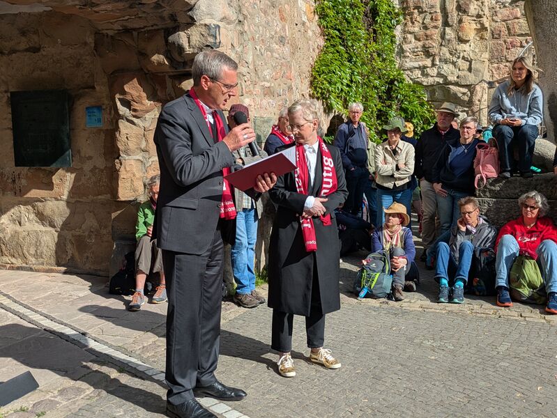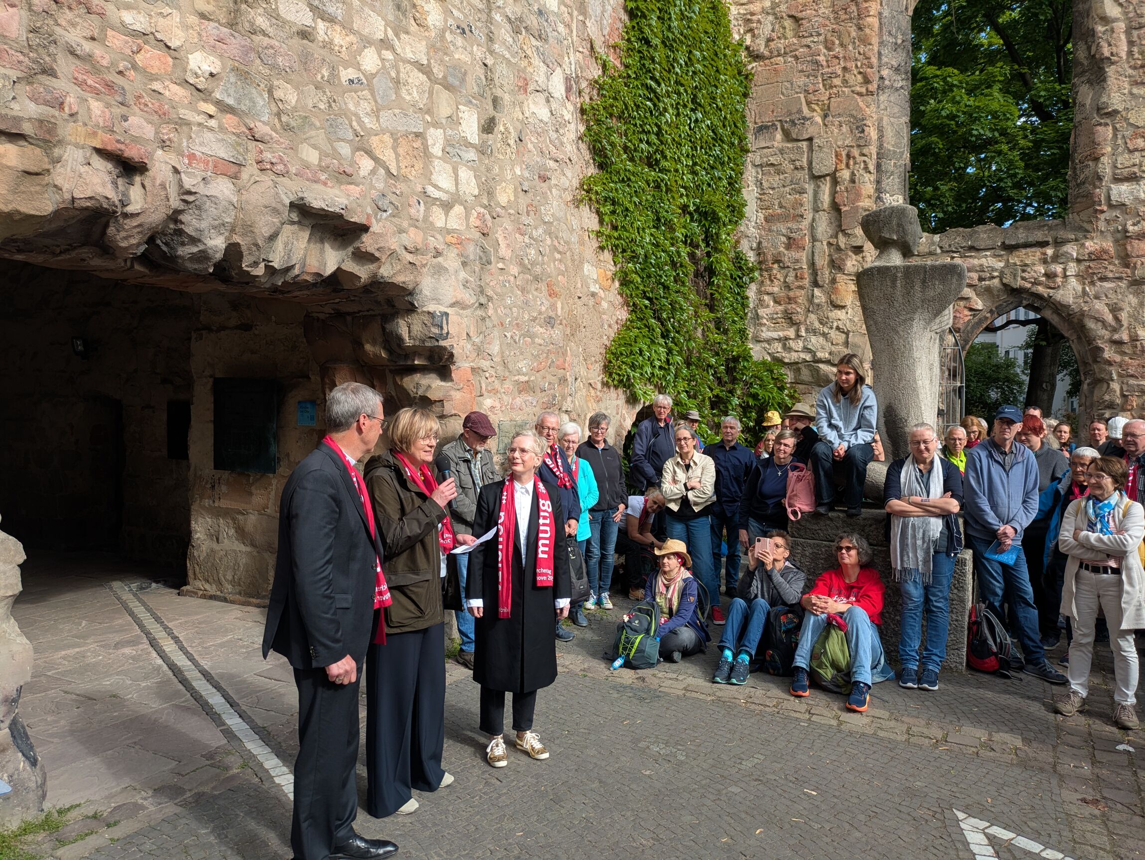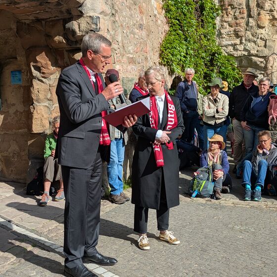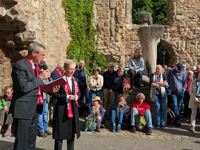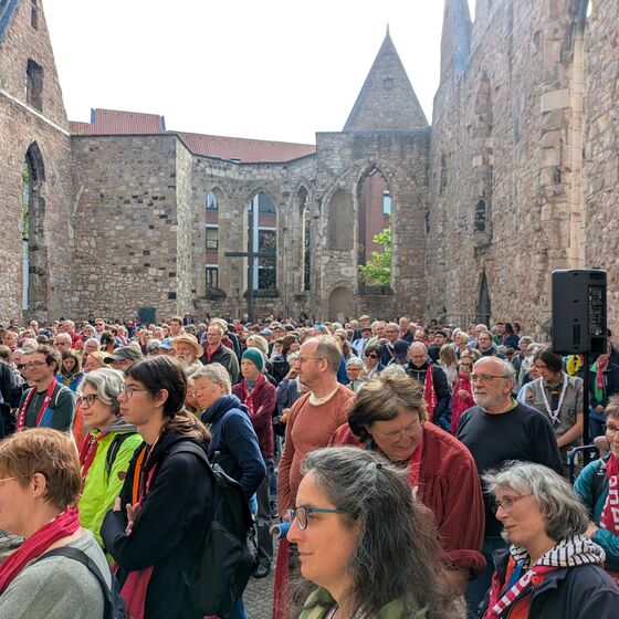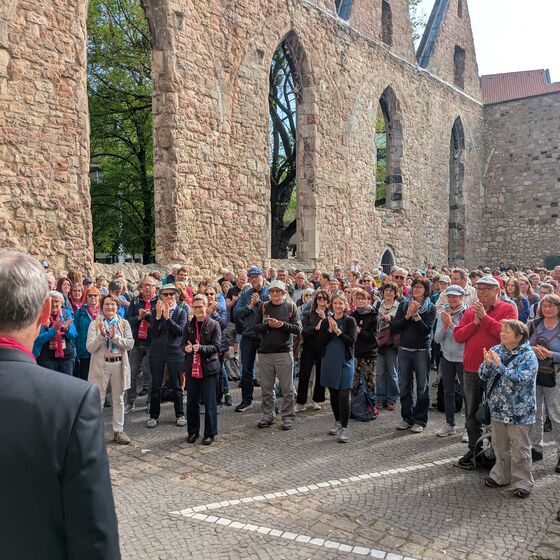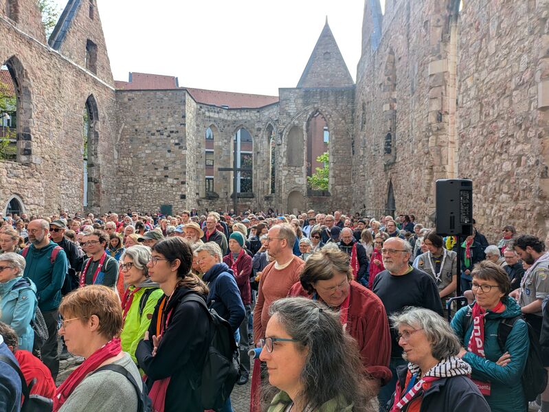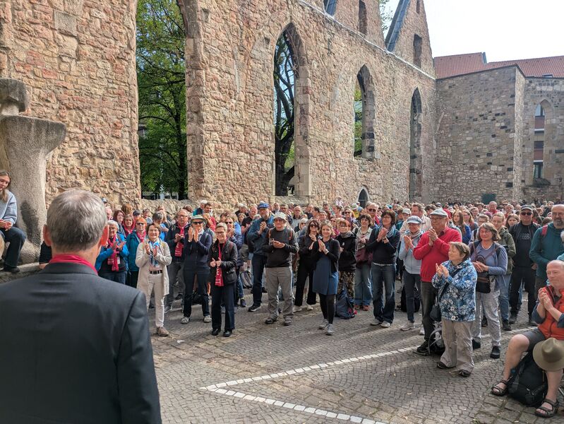 Der Auftakt dieser „Bibelarbeit auf dem Weg" fand in der Ruine der Aegidienkirche statt. Inmitten der rund 200 Gäste erinnerte Bischof Wilmer an das Osterzeugnis der Frauen am Grab und sprach über die Kraft, die aus dem Zerbrochenen wächst: „Es gibt einen Riss in allem – so kommt das Licht herein. Vielleicht ist das das tiefste Bild für Ostern. Nicht das makellose Grab. Nicht das lückenlose Leben. Sondern der Riss. Die Ruine.“