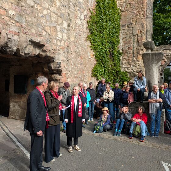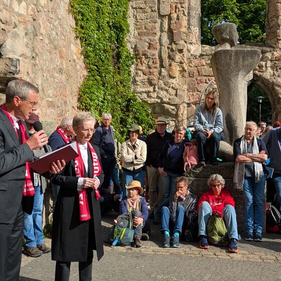 Im zweiten Teil führte Regionalbischöfin Bahr die Bibelarbeit fort. Trotz Straßenverkehr und Baustellenatmosphäre mit Blick auf die eingerüstete Martkkirche sprach sie über die Frauen, die die Osterbotschaft zuerst hörten – voller Furcht, aber auch mit Hoffnung in den Sprunggelenken, denn das Wort „Hoffnung kommt von hüpfen". Zugleich rief sie dazu auf, sich gegenseitig Mut zu machen – mit kleinen Kräften, die sich in der Gemeinschaft vervielfachen: „Wir sind ja nicht alleine. Wir sind schon drei. Das ist der Übergang zu Vielen."
