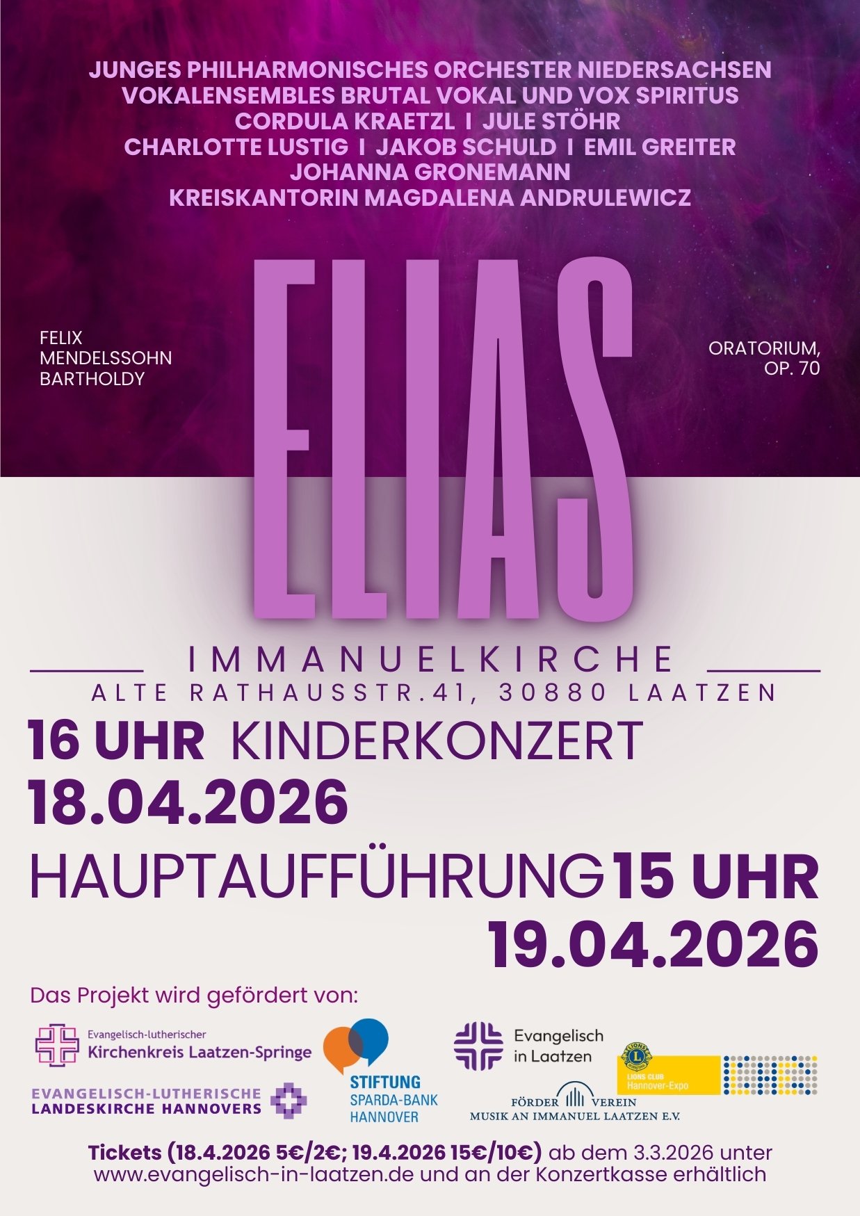 Den Höhepunkt des Projekts bildet die konzertante Aufführung am Sonntag, den 19. April 2026 um 15 Uhr. Zu hören ist Elias – ein Werk voller Ausdruckskraft, Dramatik und Hoffnung. Interpretiert wird das Oratorium vom Junges Philharmonisches Orchester Niedersachsen sowie den Vokalensembles Brutal Vokal und Vox Spiritus. Die musikalische Leitung übernehmen Johanna Gronemann und Magdalena Andrulewicz.